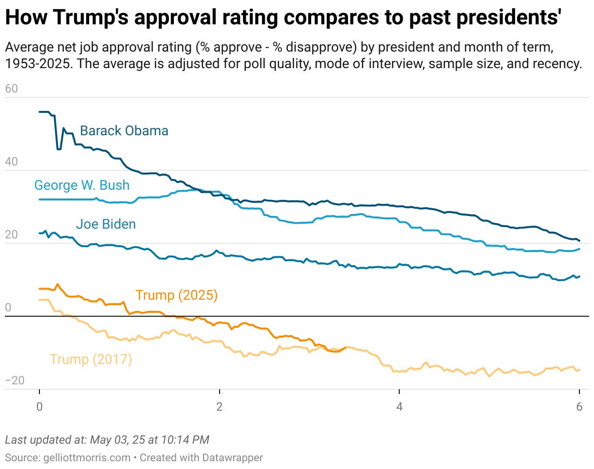We don’t have any recent public polling on how Iowans view Trump. But numerous nationwide polls indicate he has lost a lot of support since his inauguration. More than one pollster has found Trump’s approval rating lower than what previous presidents had at this point in their tenure. G. Elliott Morris created this graph for his Strength in Numbers newsletter.
