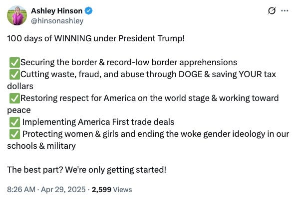 But to hear U.S. Representative Ashley Hinson tell the story, the country has experienced “100 days of WINNING under President Trump!” The Republican from Iowa’s second Congressional district told reporters on May 2 that the president is “ushering in the new era, the golden age for our economy.”