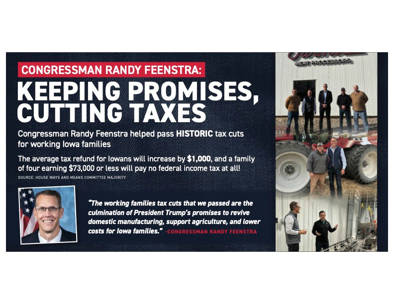 Feenstra’s voice: Hi, it’s Congressman Randy Feenstra. In 2025, I worked with President Trump to advance America First policies and defend our conservative values. We delivered the largest tax cuts for working families in U.S. history, completely securing our border, and unleashed American energy production.
