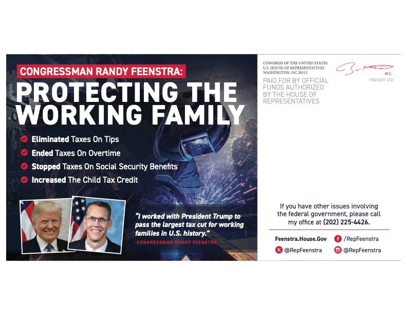The U.S. House database of franked communications shows Feenstra also spent official funds on four direct mail pieces in January—three of them timed to reach households during the two weeks before the caucuses. Currently available documents do not show how much was spent on those mailings, but past budget reports suggest the cost ran well into five figures.