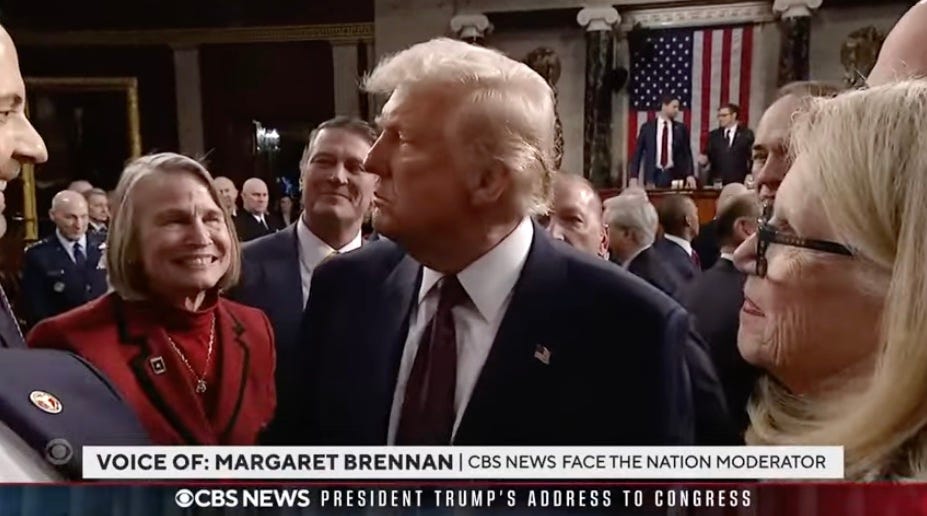 Following Trump’s speech to a joint session of Congress on March 4, Miller-Meeks made it her mission to have a few words with the president. In this footage from CBS News, you can see her jockeying for position, trying to get close to Trump—who did not appear to acknowledge her, even as she spoke to him. I’ve cued up the video to the relevant part. Watch for about 30 seconds: