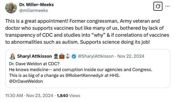 I haven’t seen any public statements from the incumbent about the White House withdrawing Weldon’s nomination on March 13, while he was en route to his Senate confirmation hearing. He’s still claiming the MMR (measles, mumps, rubella) vaccine is unsafe, even as the U.S. deals with its largest measles outbreak in years.