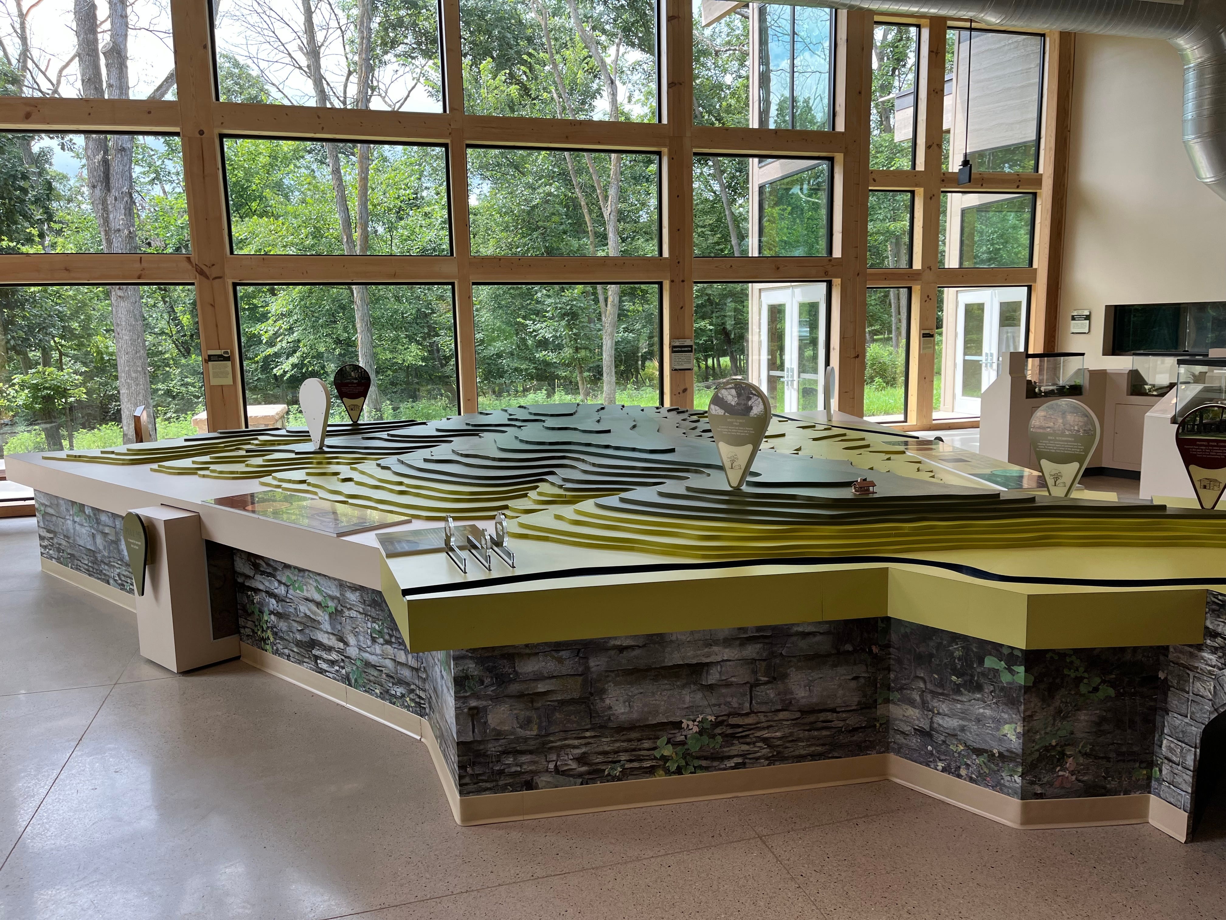 We spent a few hours at the nature center in Pammel State Park on Saturday morning. It was too hot to go for a hike, but I enjoyed this exhibit showing the area’s unusual topography. The limestone “backbone” supports oak savannas, including some trees that are more than 300 years old.
