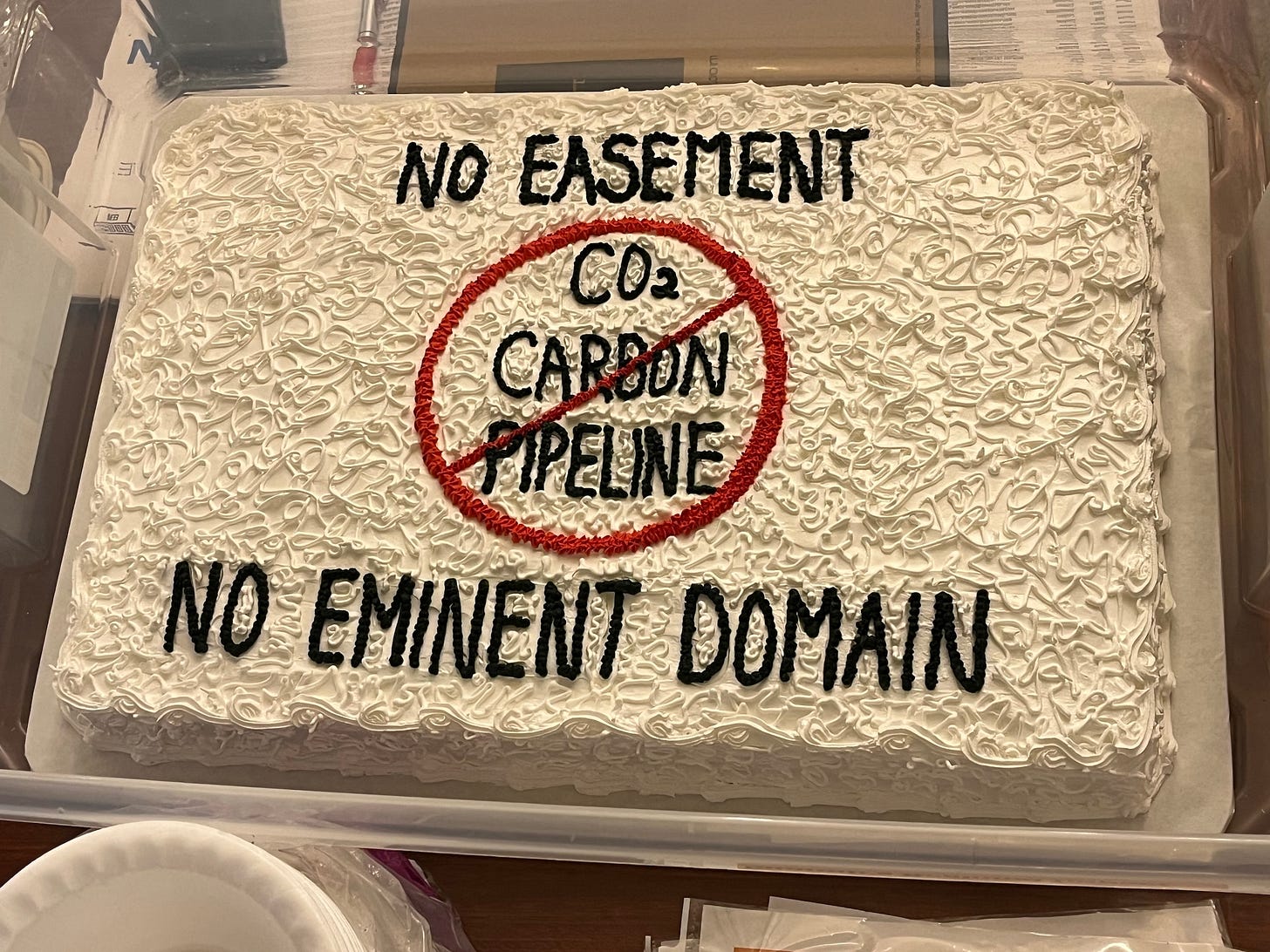 While looking through Federal Election Commission filings for Laehn’s exploratory committee, I noticed that Kim Junker is one of his donors. She’s among the landowners who have frequently come to the state capitol over the past several years, urging lawmakers to block the use of eminent domain for CO2 pipelines. Junker is the only citizen lobbyist I’ve ever encountered who sometimes brought a home-made cake to share, decorated with her key demands.