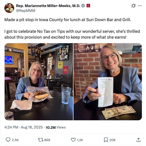 The Iowans in Congress have been touting that big budget reconciliation bill, and Representative Mariannette Miller-Meeks (IA-01) got a lot of attention for a social media post that celebrated the “no tax on tips” policy.
