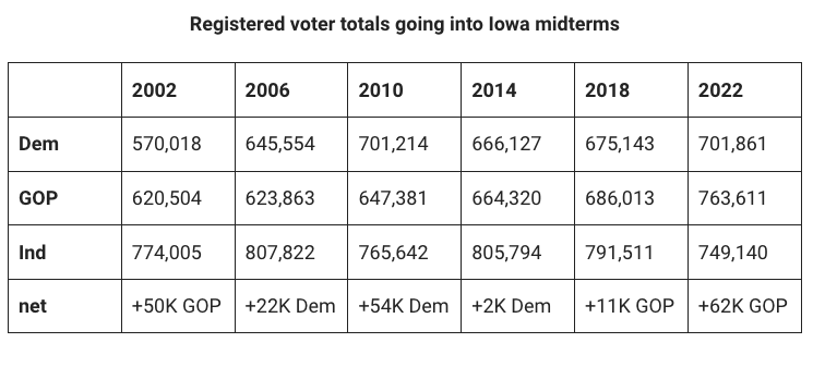 But I do know this: while Hubbell could have won in 2018 with solid base turnout and a clear majority among independents, that formula won’t work next year unless Iowa Democrats find a way to shrink the GOP’s voter registration advantage.