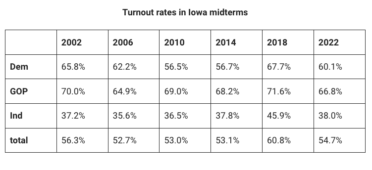 I created this table using figures the Iowa Secretary of State’s office released at the beginning of November in each midterm election year. The numbers reflect all registered voters (“active” plus “inactive”) but don’t include anyone who registered on election day after Iowa enacted same-day registration in 2007.