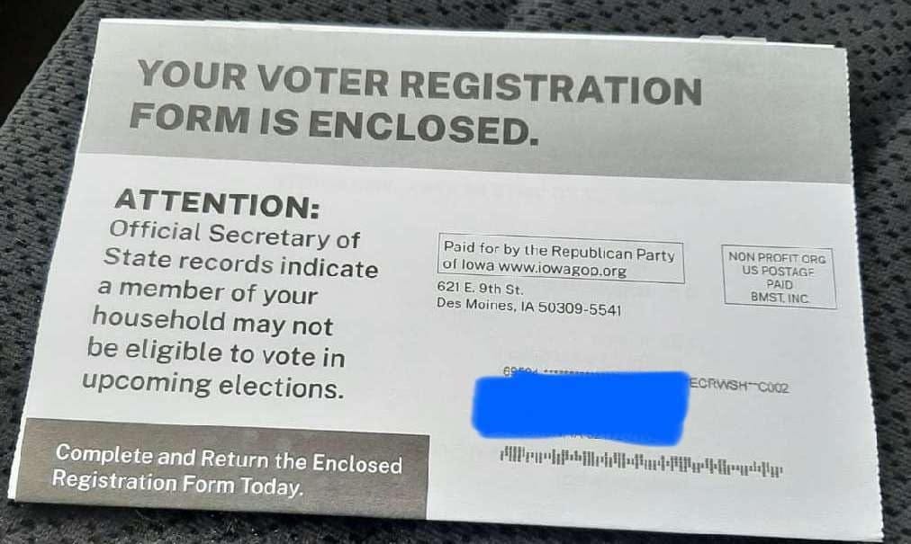 Here’s an example of a mail piece the Iowa GOP sent out in August 2021. I’m not saying Democrats should copy this wording or layout. But mail may be a viable way to reach some eligible voters, particularly those who used to be registered and may not know they were removed from the rolls this year.