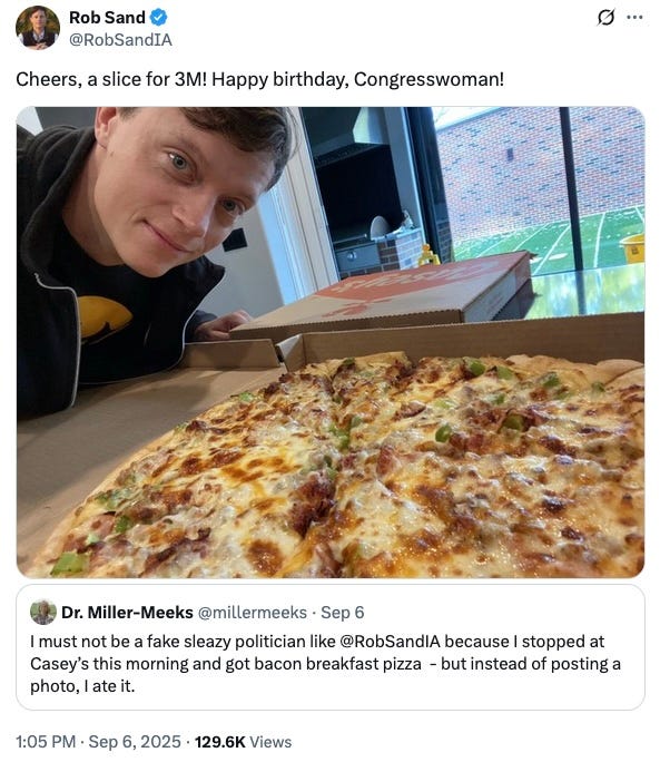 U.S. Representative Mariannette Miller-Meeks posted on X/Twitter earlier this month, “I must not be a fake sleazy politician like @RobSandIA because I stopped at Casey’s this morning and got bacon breakfast pizza – but instead of posting a photo, I ate it.” Sand responded by wishing Miller-Meeks a happy birthday, alongside a photo of himself with a pizza.