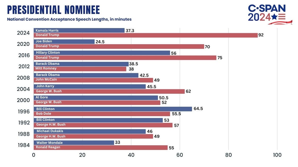 Harris covered a lot of ground in a relatively concise way. According to C-SPAN, it was the third-shortest presidential nominee’s acceptance speech of the past 40 years—not even half as long as Donald Trump’s rambling, mind-numbing monologue at the RNC.
