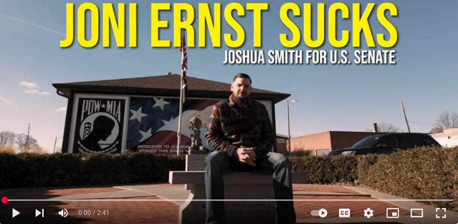 “You suck, Joni! That’s just the nicest way I can summarize how we’re all feeling about your reign so far,” says Joshua Smith in the first digital ad promoting his Republican campaign for Iowa’s U.S. Senate seat.