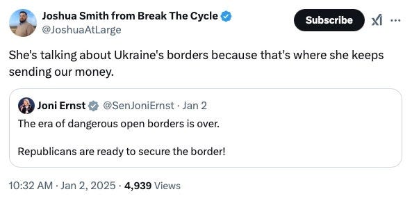 I continue to believe that unless Trump publicly weighs in against her, Ernst will be heavily favored to win the 2026 nomination. And she seems determined not to give the incoming president any reason to back a primary challenger.