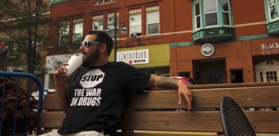 The anti-war emphasis is one example. In addition, some footage shows Smith wearing a “STOP THE WAR ON DRUGS” t-shirt.